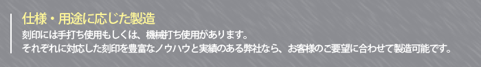 70年間、常に「お客様が求める良い刻印を提供したい」という一心で努力してきました。昭和初期から続く歴史と豊富な経験に基づいて作られる刻印の特徴は、「より精密で、耐久性のある刻印」です。あらゆるサイズ・種類の在庫を豊富に有しており、即納を心がけております。